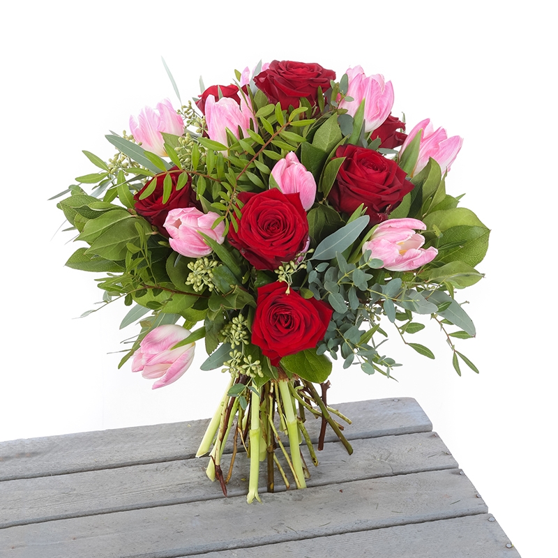 A Elegant Handtied consisting of Tulips and Roses, finished with beautiful foliage.